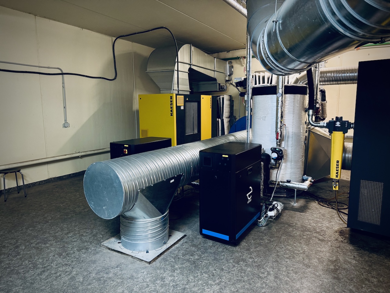 Dviem kompresoriams (55 kW ir 37 kW) įrengėme šilumos atgavimo sistemą, kuri pagamintą atliekinę šilumą perduoda gamybos procesams šildyti.